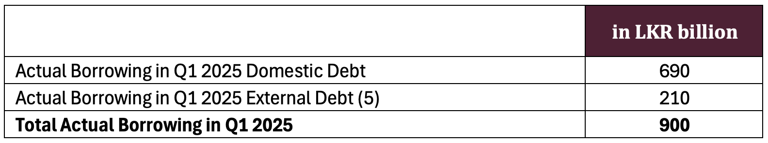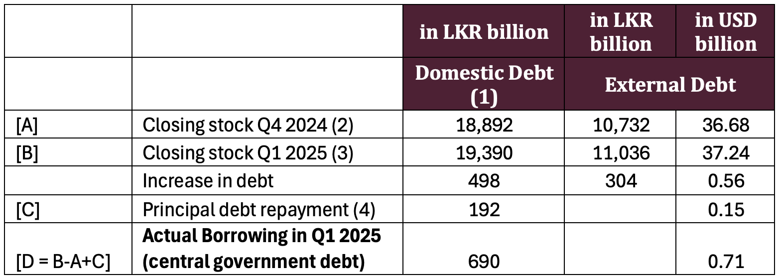 - Actual borrowing in Q1 2025 for External debt amounts to USD 710 million. This was converted into LKR billion using the exchange rate of 1 USD = LKR 296.3472 as of 28th March 2025.