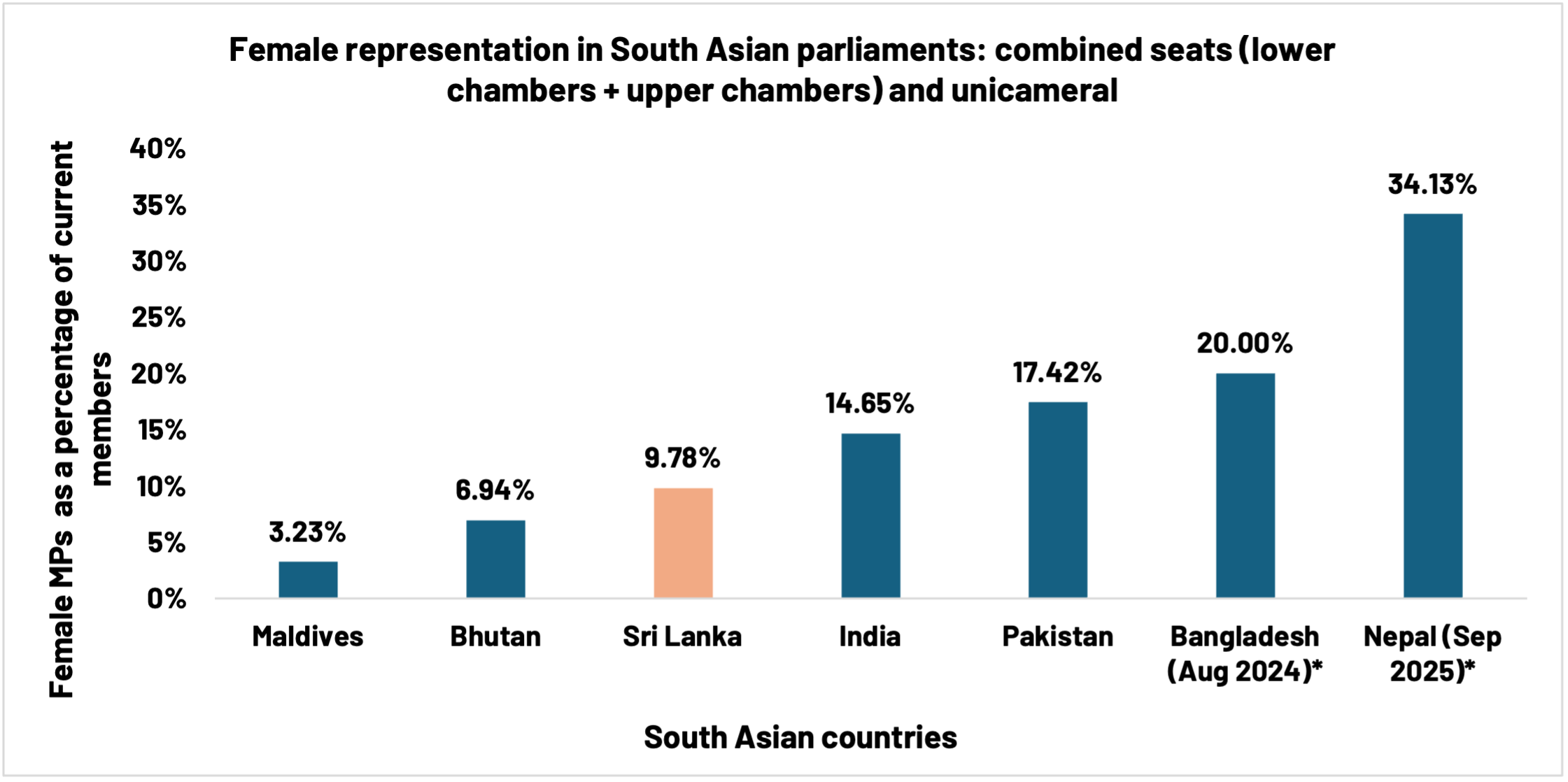 Additional Note 2: Except for Sri Lanka, the Maldives, and Bangladesh, all other South Asian countries have bicameral parliaments with two chambers. For Exhibit 2, the analysis focused on the lower chambers, as recommended by the UN in the Sustainable Development Goals methodology for indicator 5.5.1a, since their members are directly elected and tend to win in a manner similar to Sri Lanka’s parliament.