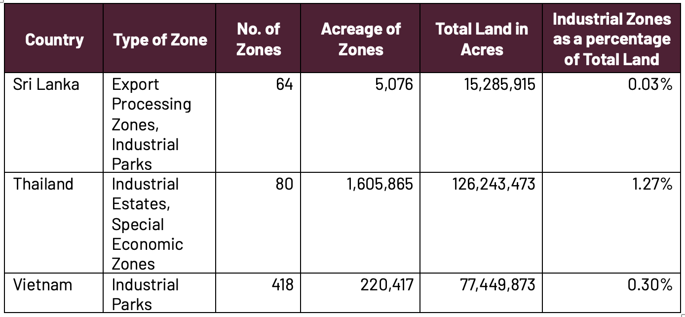 The share of land allocated for industrial zones in Vietnam is 0.30% (ten times more than Sri Lanka) and 1.27% in Thailand (forty time more than Sri Lanka).