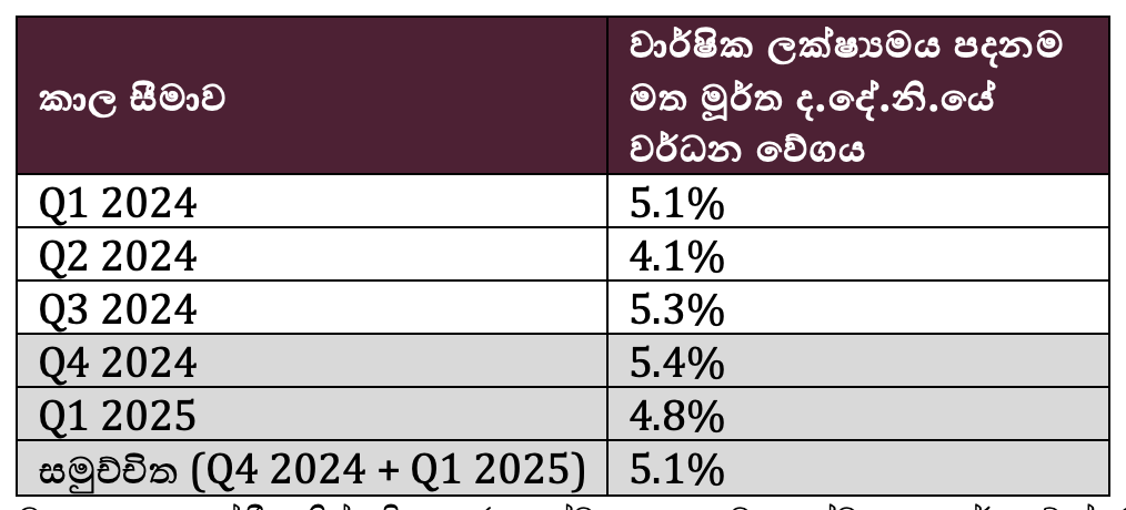 2024 සිව්වන කාර්තුවේ සහ 2025 පළමු කාර්තුවේ කාර්තුමය වර්ධන වේගයන් මෙහිදී අප විසින් පරීක්ෂාවට ලක් කරන ලදි (ඒ සම්බන්ධයෙන් වන හේතු දැක්වීම ඉහත කොටසේ දක්වා ඇත). අංක 1 වගුවෙහි පෙන්වා දී ඇති පරිදි, මෙම කාර්තු දෙකෙහි (එනම්, පෙර වසරේ එම කාර්තුවට සාපේක්ෂව) වාර්ෂික ලක්ෂ්යමය පදනම මත (YoY) වර්ධනයන් පිළිවෙලින් 5.4% ක් සහ 4.8% ක් වේ. එය නියෝජ්ය අමාත්යවරයා විසින් උපුටා දක්වන ලද 8.3% ක අගයට වඩා බෙහෙවින් අඩු අගයකි. මෙම කාර්තු දෙක සඳහා වාර්ෂික ලක්ෂ්යමය පදනම මත වර්ධනයේ සමුච්චිත අගය 5.1% ක් වන අතර, එය ද ඔහු විසින් ප්රකාශ කරන ලද 8.3% ක අගයට වඩා අඩු වේ.