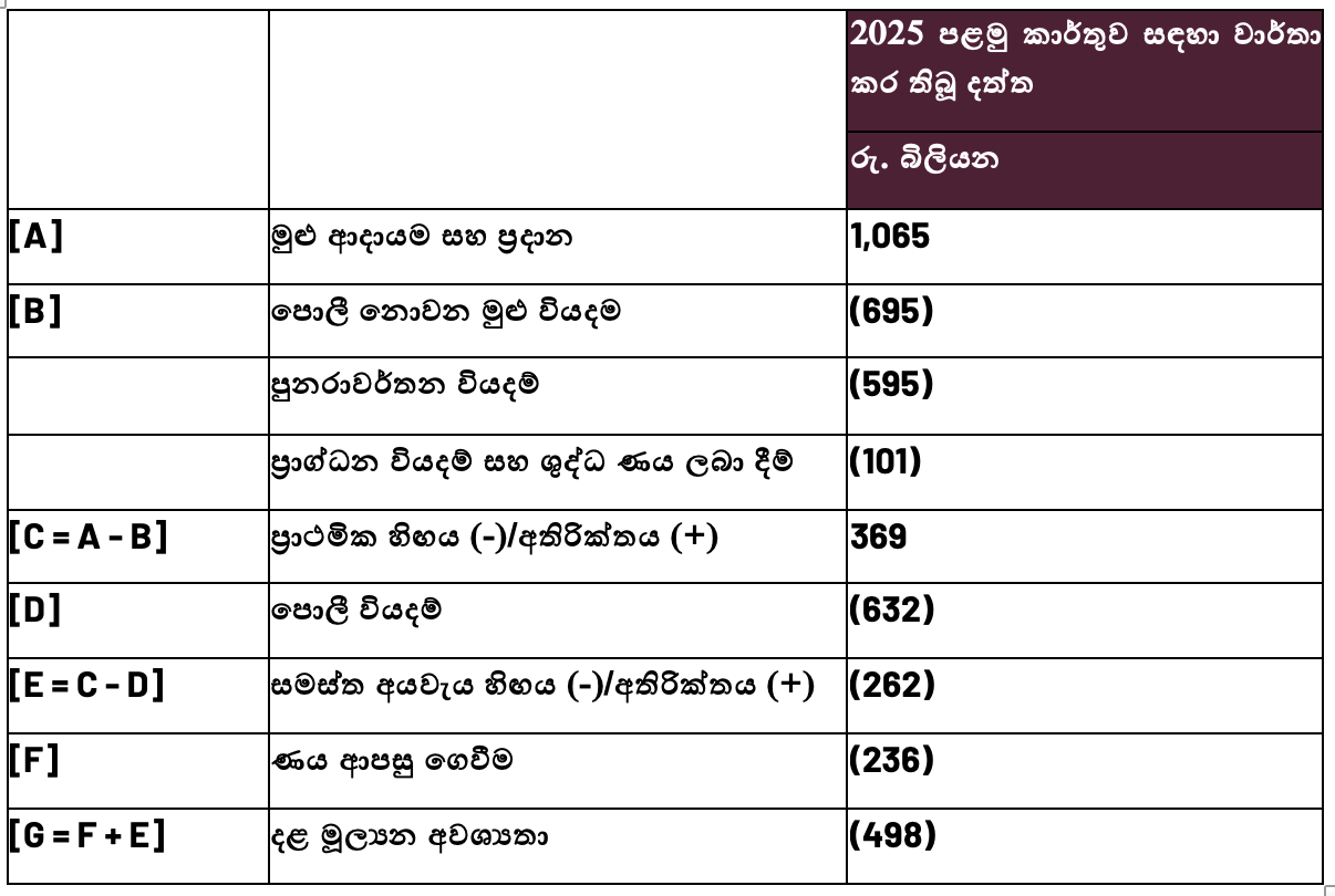 මූලාශ්රය: 2025 මාර්තු 31 වැනි දිනයෙන් අවසන් වන පළමු කාර්තුව දක්වා රජයේ මූල්ය කාර්ය සාධනය