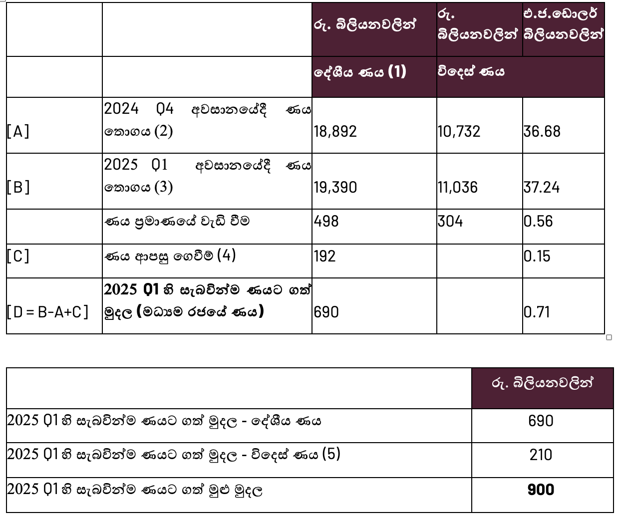 - 2025 පළමු කාර්තුව තුළ සැබවින්ම ලබා ගෙන ඇති විදෙස් ණය ප්රමාණය එ.ජ.ඩොලර් මිලියන 710 කි. 2025 මාර්තු 28 වැනි දින එ.ජ.ඩොලර් 1 = රු. 296.3472 වශයෙන් පැවති විනිමය අනුපාතය යොදා ගනිමින් මෙය රුපියල් බිලියනවලට හරවා ඇත.