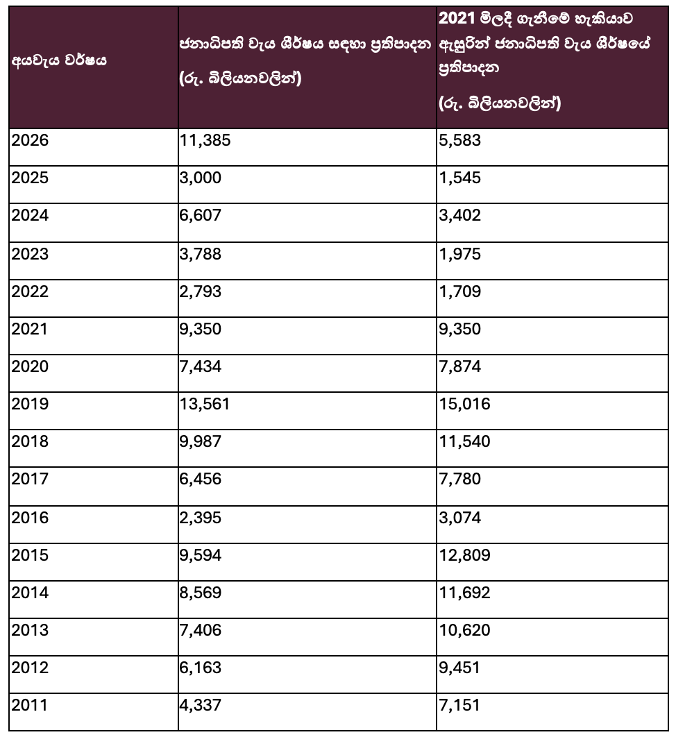 අංක 1 වගුව: ජනාධිපති වැය ශීර්ෂය සඳහා වෙන් කරන ලද ප්‍රතිපාදන: නාමික සහ මූර්ත අගයන් ඇසුරින් (2011 – 2026